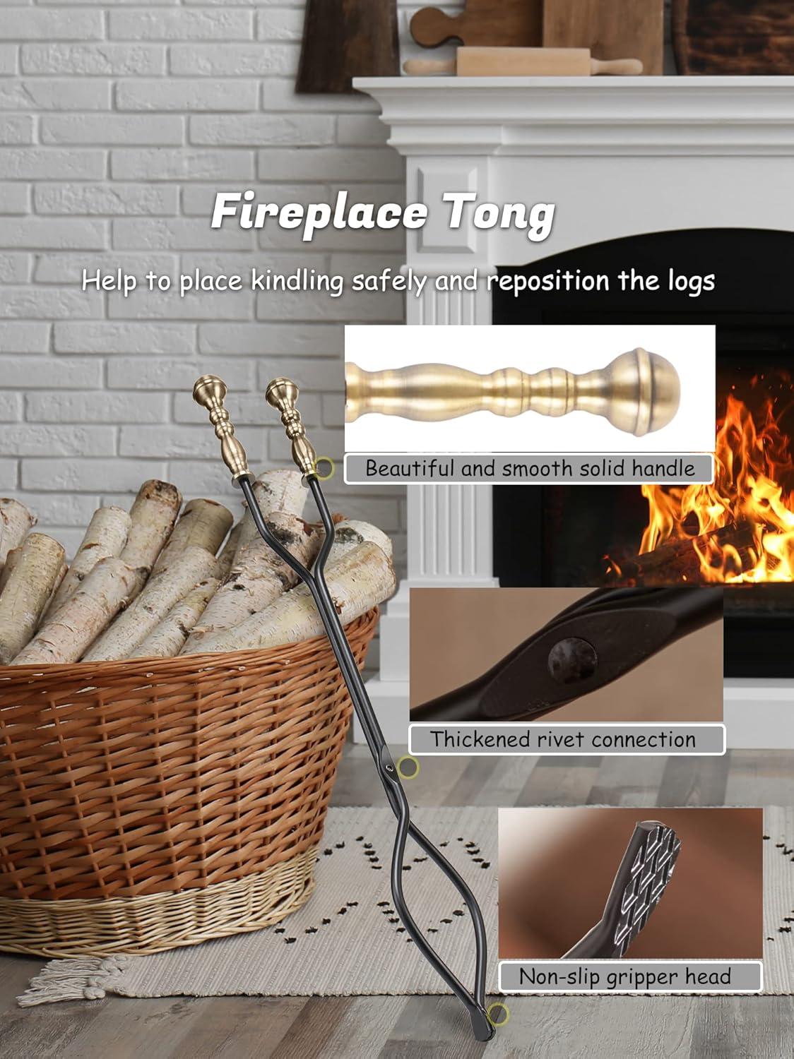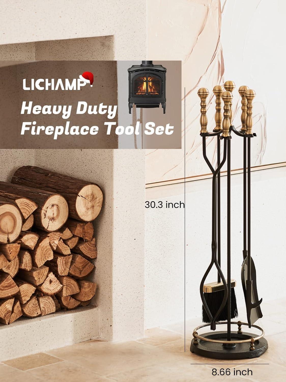 Lichamp Fireplace Tools Set, 5-Pieces Indoor Outdoor Sturdy Fire Place Poker Sets with Retro Gold Handle, FTS45GD